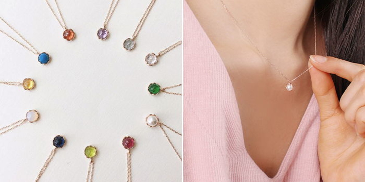골드빛 목걸이 아래로 떨어지는 아름다운 탄생석 목걸이는 5만 9,900원에 구매할 수 있다.