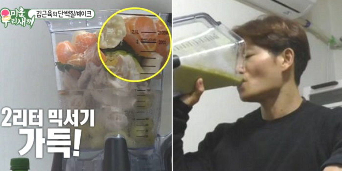 그는 닭 반 마리 양에 해당하는 닭가슴살 400g에 이어 청포도, 아몬드, 케일, 바나나 등 여러 가지 재료를 꽉꽉 눌러 믹서기의 2리터를 가득 채워 셰이크를 직접 제조했다.