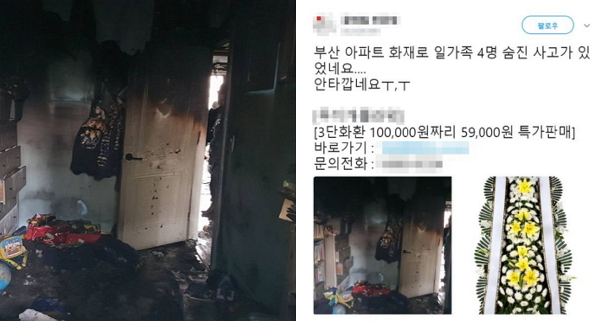 홈페이지 주소와 전화번호까지 적은 업체는 부산 화재 현장과 근조 화환 사진을 함께 게재하기도 했다.