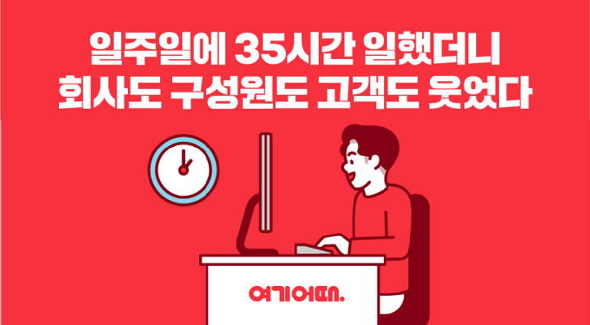 여기어때 주 35시간 근무제에 따르면 전 구성원은 매주 월요일 오후 1시에 출근하고, 화요일~금요일은 오전 9시 출근, 오후 6시에 퇴근한다. 점심 시간은 1시간 30분이다. 일명 '4.5일 근무제'로 불린다.