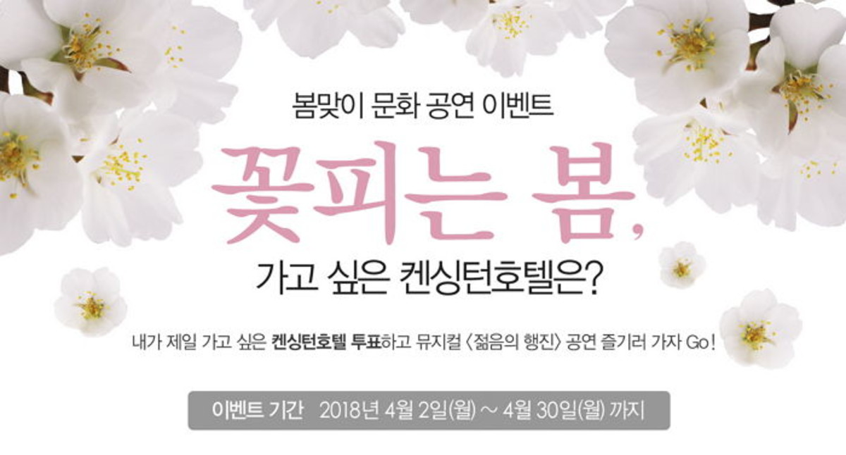 이번 이벤트는 전국 켄싱턴호텔 7개 지점 중 가장 가고 싶은 지점을 투표하면 추첨을 통해 신보라, 강동호 출연의 주크박스 뮤지컬 '젊음의 행진' R석 티켓을 증정하는 이벤트다.