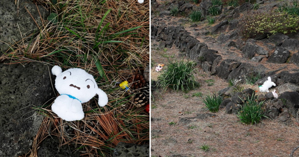 아름다운 제주 봄 풍경을 뒤로하고 포착된 돌무더기 위로는 인기 만화 '짱구는 못 말려'의 강아지 캐릭터 흰둥이 인형 등과 꽃, 과자, 장난감 등이 놓인 모습이다.