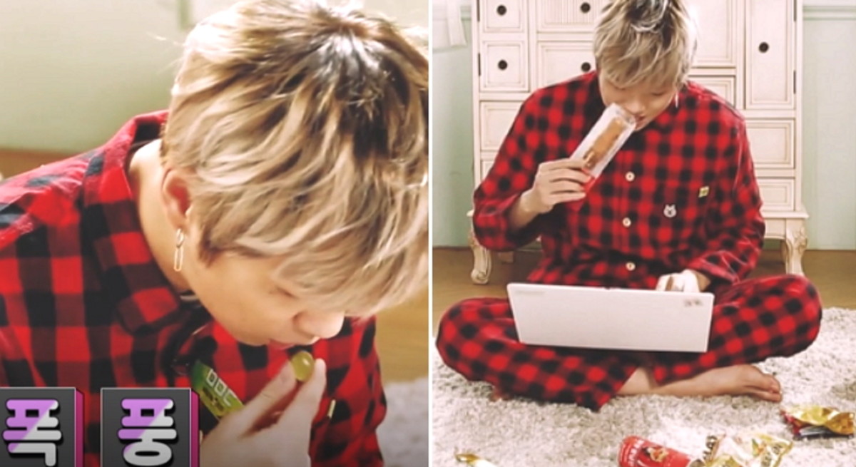 한가득 다 먹은 강다니엘은 젤리에 이어 핫바, 봉지 과자를 폭풍 흡입했다.