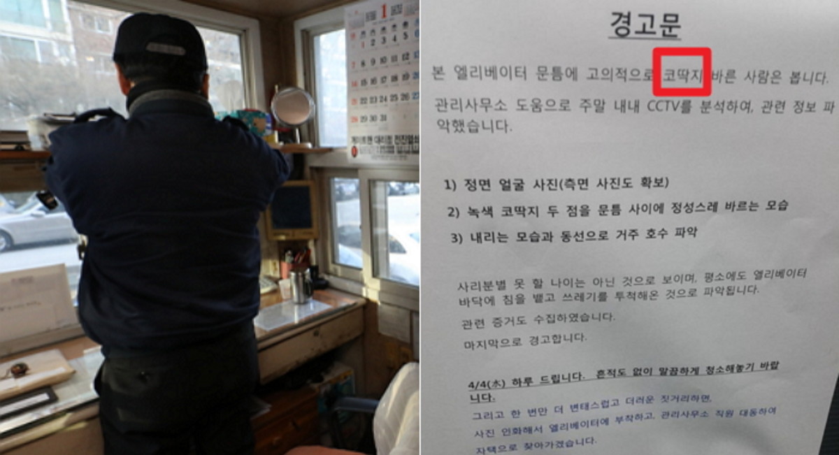 5일 한 온라인 커뮤니티에는 '엘리베이터 문틈에 고의로 코딱지 바른 사람은 보라'는 내용의 경고문 사진이 올라왔다.