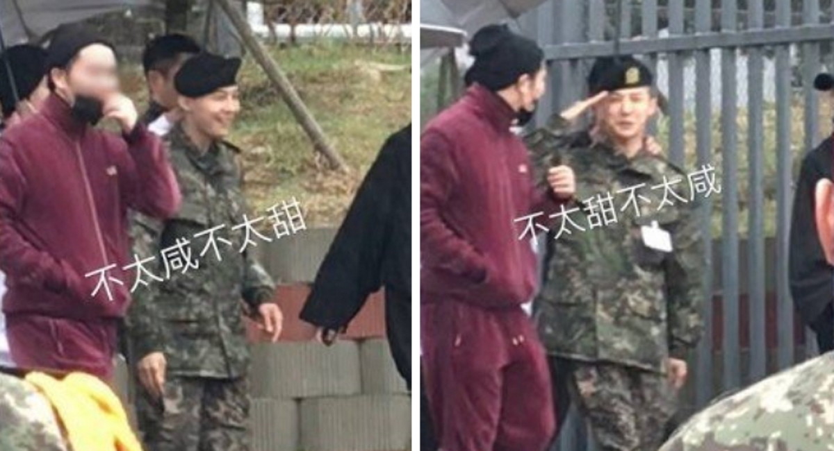 지드래곤은 일행과 대화를 나누던 중 팬의 방문을 깨닫고 가볍게 경례했다.