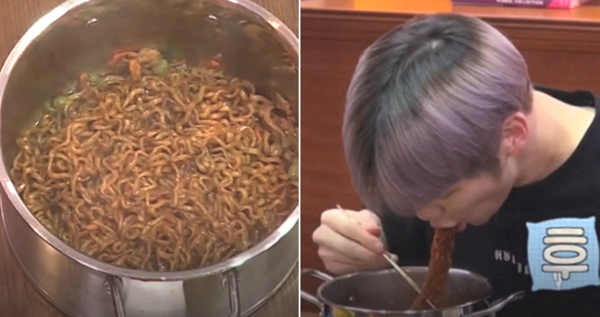 강다니엘은 너무 배고픈 나머지 짜장불닭 2개를 물도 끓기 전에 냄비에 넣었다. 라면이 다 끓기를 기다리면서도 계속해서 젤리를 먹었다.