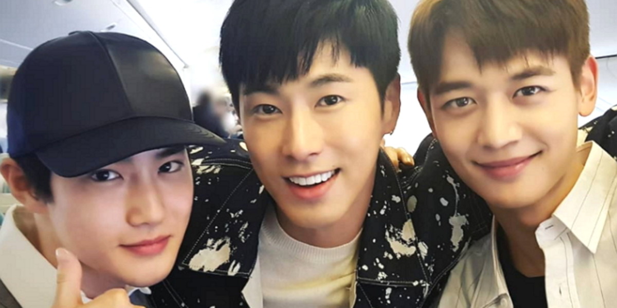 게시된 사진에는 유노윤호가 양쪽 팔을 벌려 후배인 민호와 수호에게 어깨동무를 하고 있다.