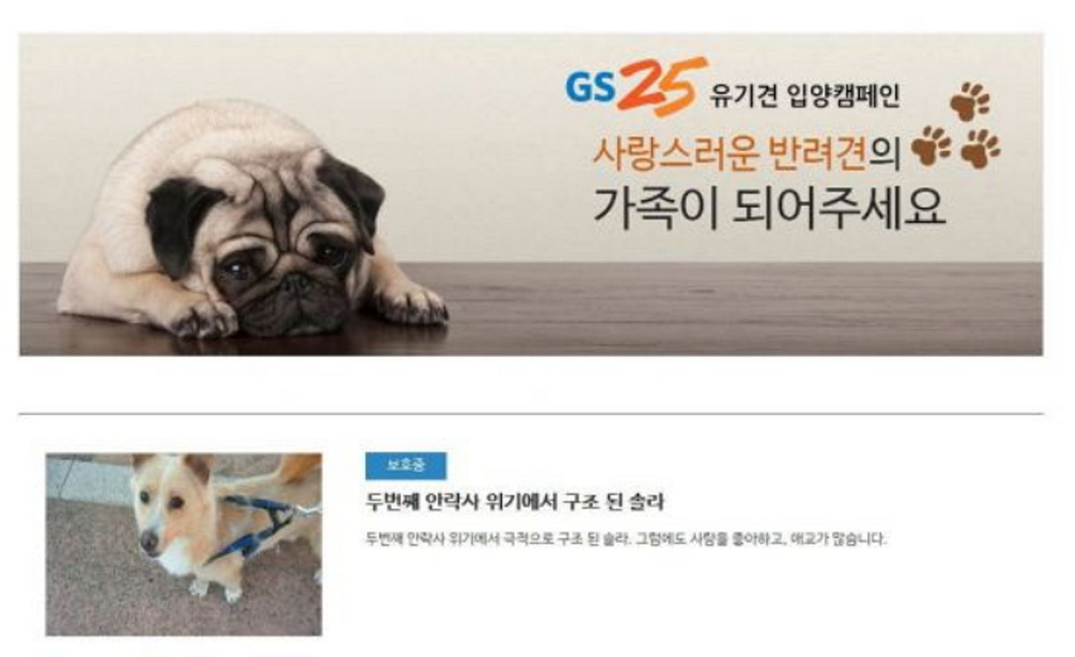 GS리테일이 운영하는 편의점 GS25는 닥터펫 동물센터와 유기견 구조단체 '유엄빠(유기견 엄마 아빠의 줄임말)'와 손잡고 유기견 입양 캠페인을 진행한다.
