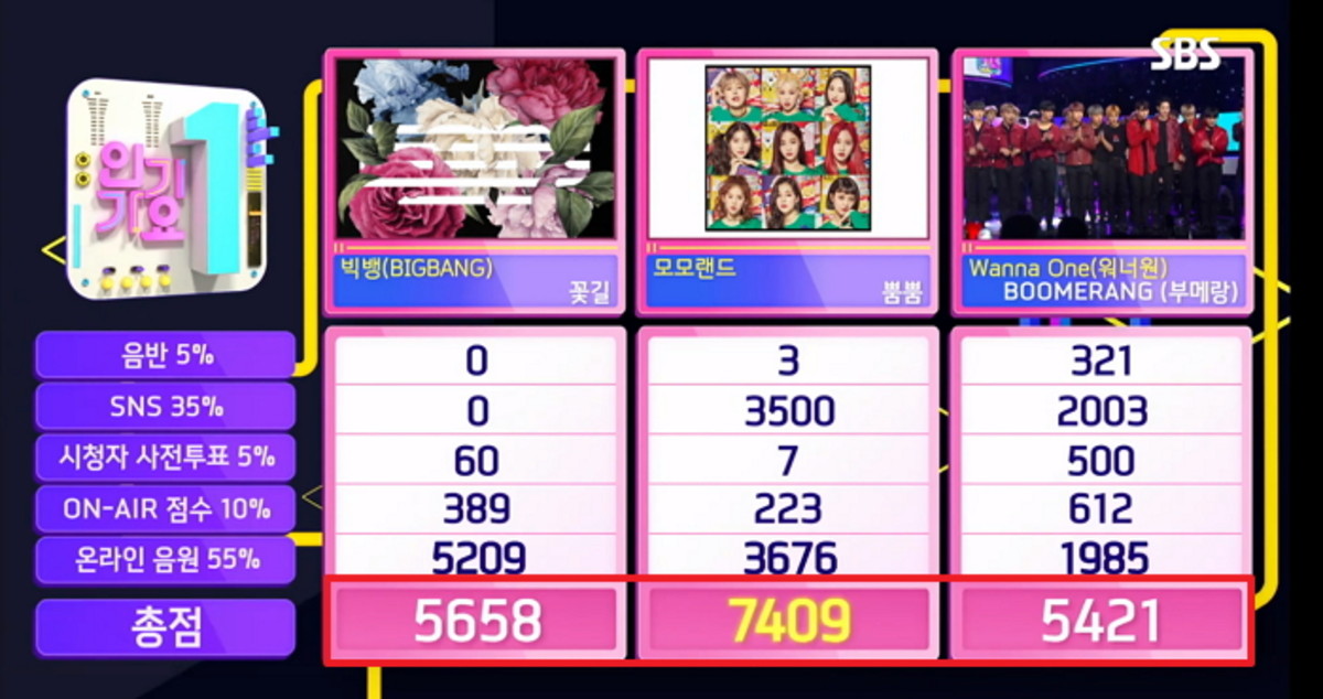 이날 집계 결과 빅뱅이 온라인 음원에서 압도적인 점수를 받았음에도 불구하고 SNS에서 높은 점수를 받은 모모랜드를 뛰어넘기에는 부족했다.