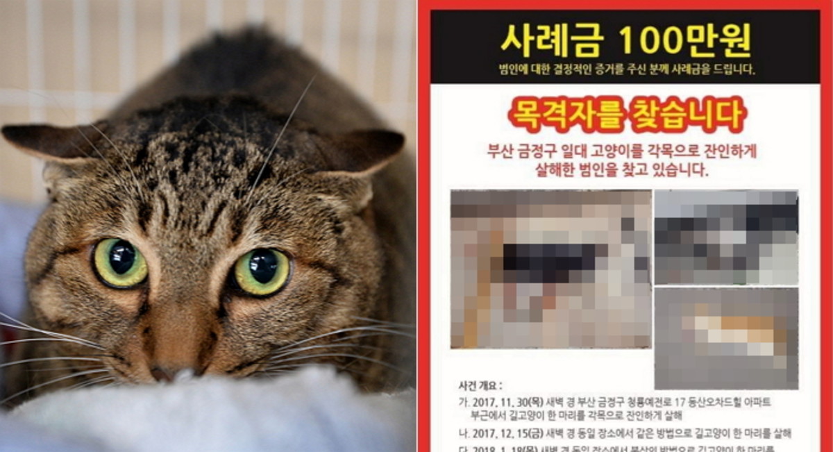 지난 6일 동물자유연대는 부산 금정구 길고양이 살해사건의 목격자를 찾는 글을 올렸다.