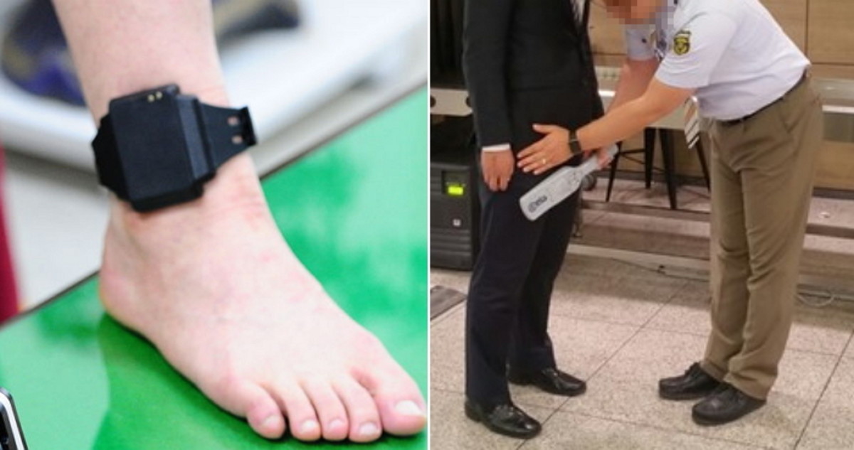 공항검색대를 통과할 때 경고음이 울렸고 보안 직원은 그가 전자발찌를 차고 있다는 사실을 확인했다.