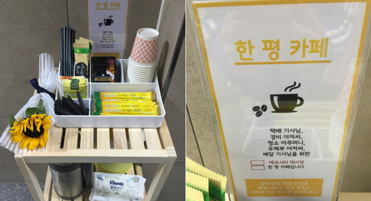 전주의 한 아파트에서는 얼마 전부터 택배기사와 경비원, 청소 노동자 등을 위한 '한 평 카페'를 운영하고 있다.