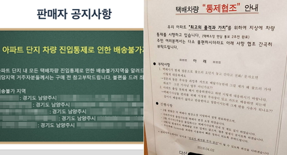 업체는 공지에 "아파트 단지 내 모든 택배 차량 진입통제로 인한 배송 불가 지역을 알려드리오니 해당 지역 거주자분들께서는 구매 전 참고 부탁드립니다"라고 적었다.