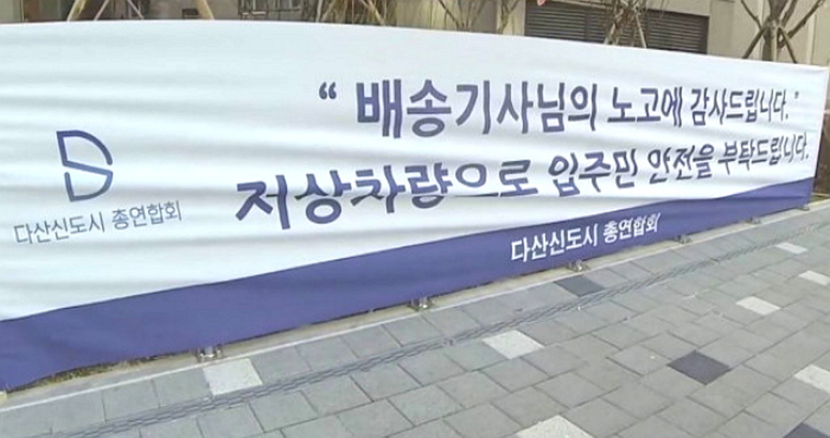 해당 현수막에는 "배송기사님의 노고에 감사드립니다. 저상차량으로 입주민 안전을 부탁드립니다"라는 내용이 담겨있었다.