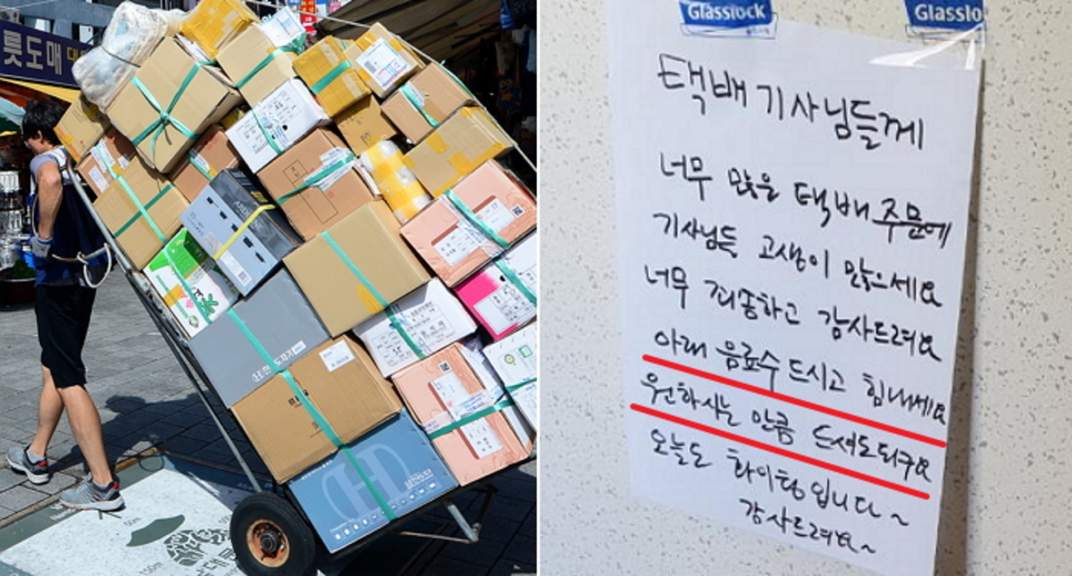 무거운 택배를 들고 집 앞까지 배달해주는 택배 기사들의 노고에 한 주민이 감사를 표한 것으로 보인다.