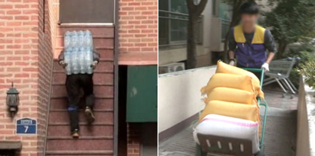 당시 주민들의 쾌적한 주거환경을 위한다는 명목으로 아파트 내 택배차가 금지돼 택배 기사들은 30도가 넘는 땡볕에 내몰려 짐을 날랐다.