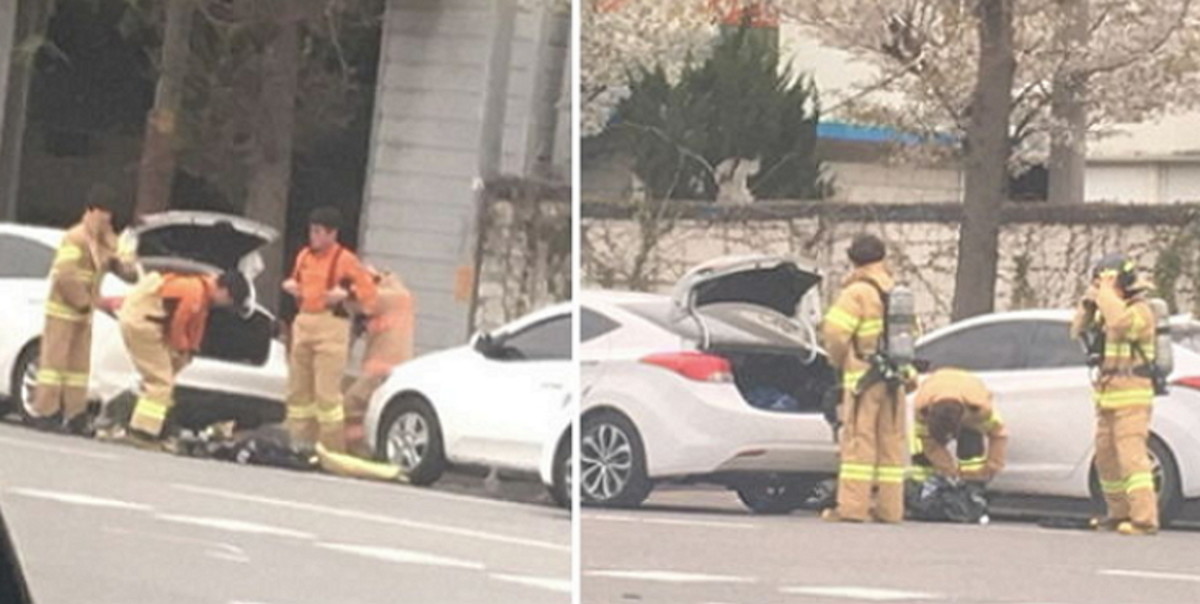 공개된 사진 속에는 승용차 트렁크에서 산소통을 꺼내 '방화 준비'를 하는 소방관들의 모습이 담겼다.
