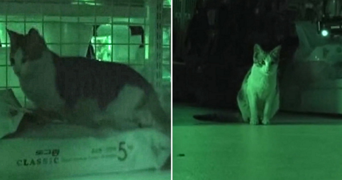 이 고양이는 모든 이들이 퇴근한 늦은 밤 마트에 들어와 손톱과 이빨을 이용해 사료 포장지에 구멍을 뚫고, 여유 있게 식사를 이어갔다.