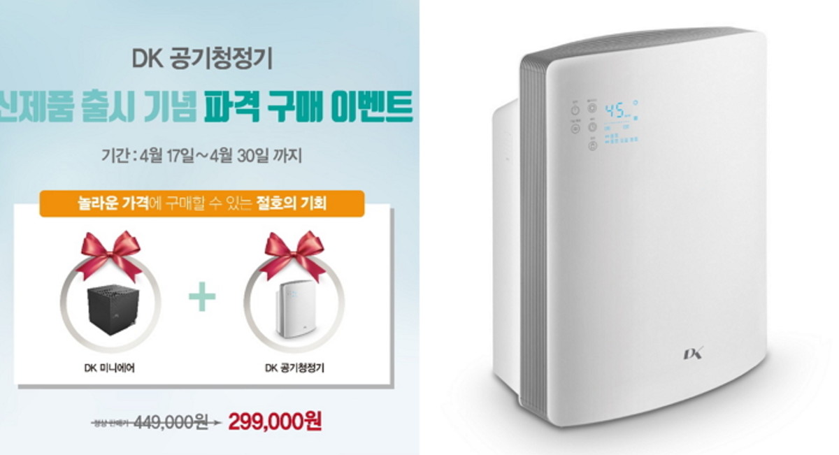 DK관계자는 "공기청정기가 가장 필요한 4월, DK 공기청정기에 고객분들의 기대에 감사하는 마음으로 이번 행사를 기획했다"며 "많은 분들이 좀 더 실속 있게 공기청정기를 구매해 깨끗한 실내에서 마음 편히 지낼 수 있기를 바란다"고 전했다.