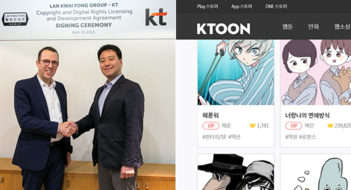 [인사이트] 최민주 기자 = KT가 홍콩 '란콰이펑 문화 영화사(Lan Kwai Fong Group Media & Culture)'와 케이툰(KTOON) 인기 웹툰을 영상화하기 위한 판권 계약을 체결했다.