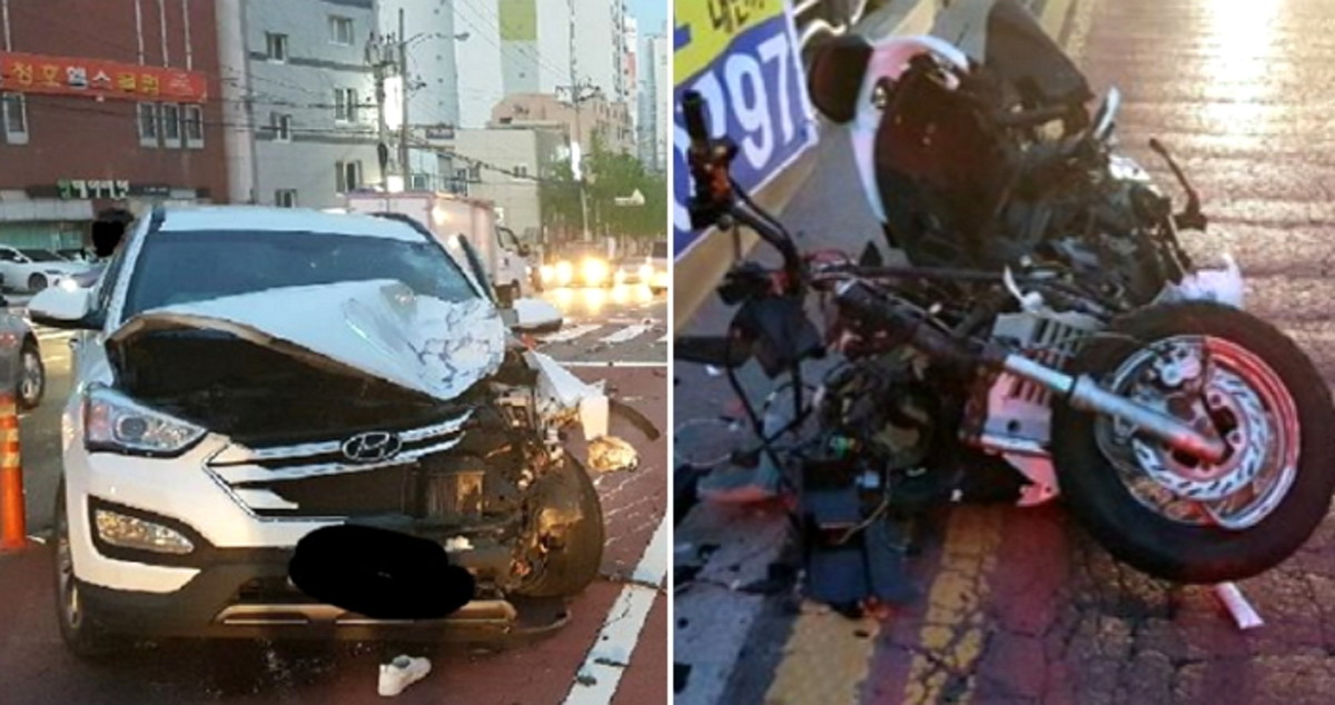 범퍼 앞부분이 완전히 반파된 차량과 형체를 알아볼 수 없을 정도로 찌그러진 오토바이가 당시 충격을 짐작게 한다.