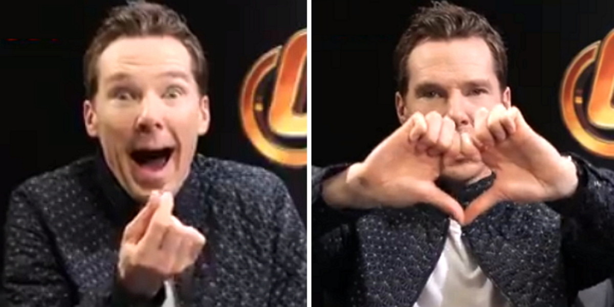 그러자 컴버배치는 눈과 입을 크게 벌리는 코믹한 표정을 지은 뒤 귀엽게 손가락 하트 포즈를 취했다.