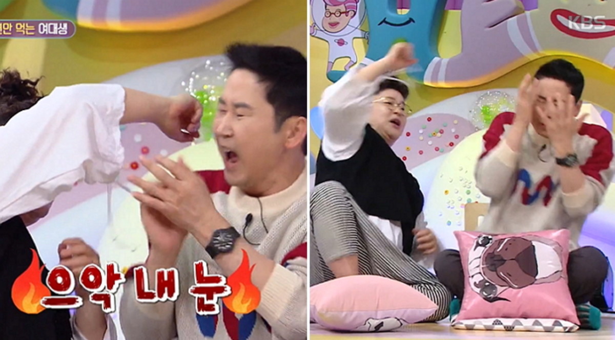 겨드랑이가 보이자마자 신동엽은 "으악 뭐야"라고 소리치며 두 손으로 눈을 가렸다.