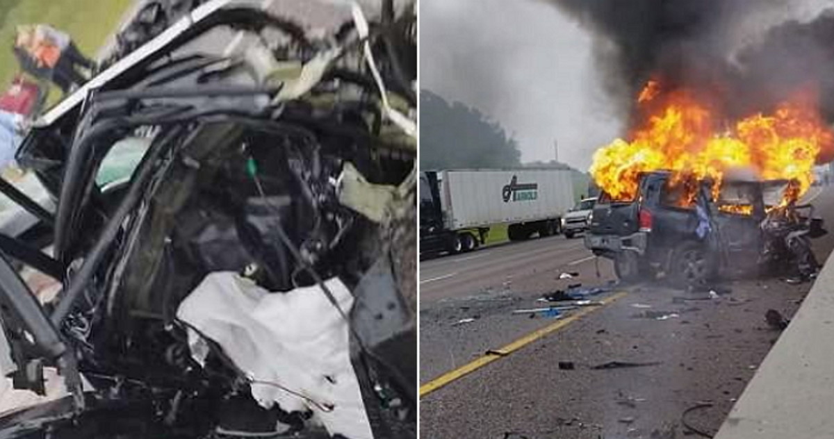 충돌 사고로 트럭은 중앙분리대를 들이받고 형태를 알아볼 수 없을 정도로 처참한 상태로 일그러졌다.