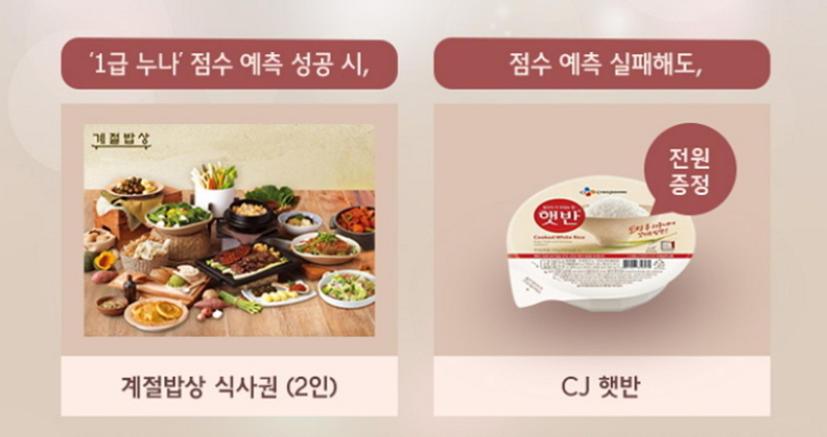 특히 이때 '1급 누나'의 시험 점수를 맞춘 수험생 전원에게는 프랜차이즈 레스토랑 계절밥상 식사권이, 혹은 예측에 실패하더라도 CJ 햇반이 돌아갈 예정이다.