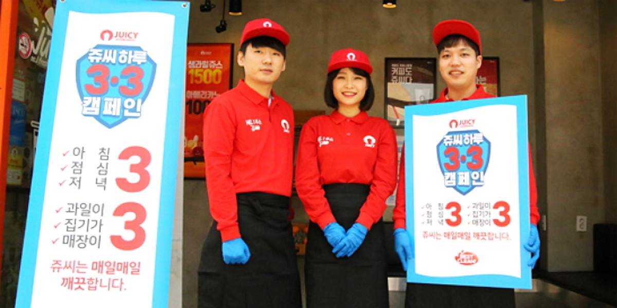 26일 생과일주스 브랜드 쥬씨가 전국 가맹점의 위생관리를 더욱 강화한다는 목표를 가지고 '쥬씨 하루 3·3 캠페인'을 실시한다고 밝혔다.