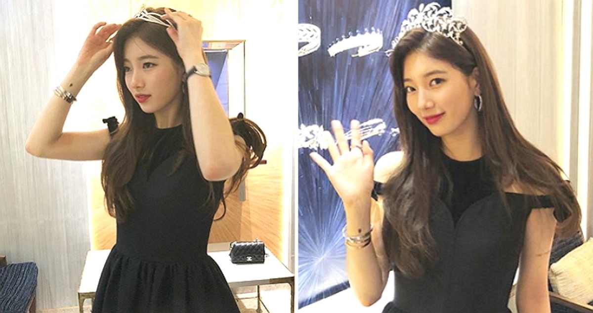 공개된 사진 속 수지는 시크한 블랙드레스를 입고 물오른 미모를 뽐냈다.