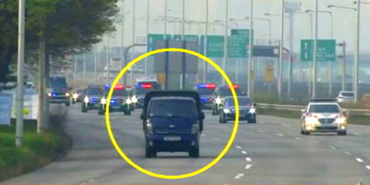 몇십 대는 족히 넘는 대통령의 차량 행렬 앞에 꿋꿋이 이동하는 '트럭 한 대'가 눈길을 사로잡았다.