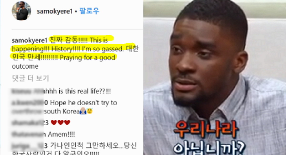 아프리카 가나 출신인 샘 오취리가 마치 원래 한국 사람이었던 것처럼 기쁜 마음을 드러내자 누리꾼들은 "역시 대한가나인"이라는 반응을 보였다.