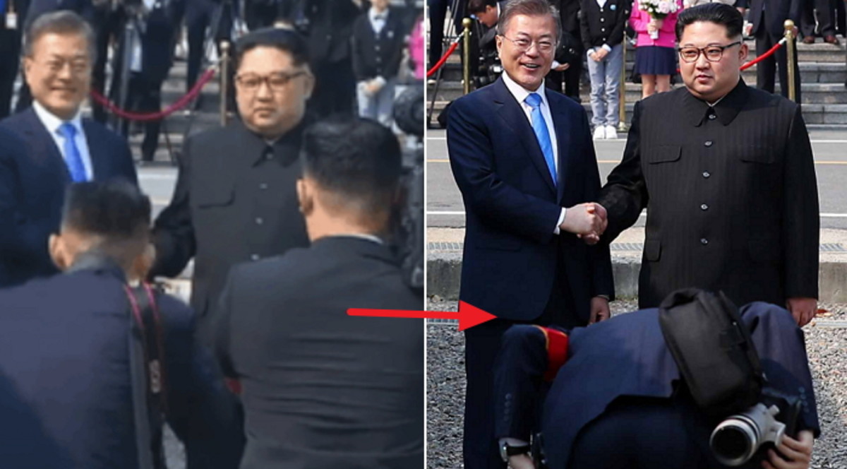 사진과 영상을 찍는 북한 기자 두 명은 두 정상이 만나는 모습을 하나라도 놓치지 않으려는 듯 왼발을 굽히며 자리를 잡았다.