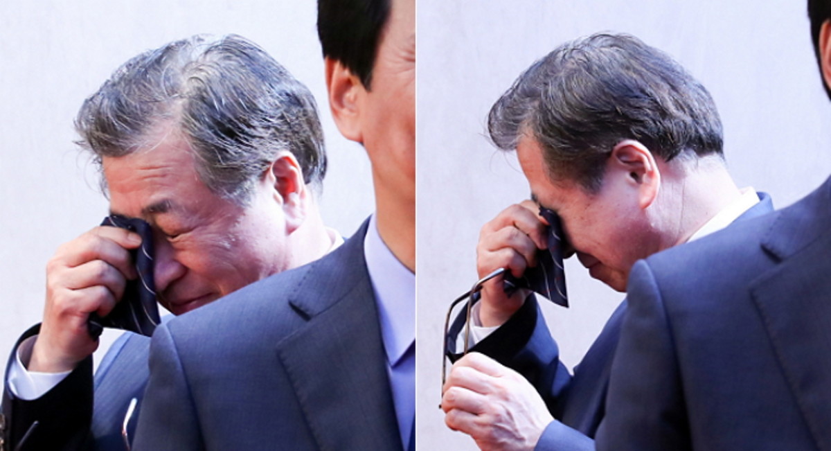 이날 문재인 대통령과 김정은 북한 국무위원장의 선언이 발표되자 임종석 청와대 비서실장 뒤에 서 있던 서훈 국정원장은 안경을 벗고 손수건으로 눈물을 닦아냈다.