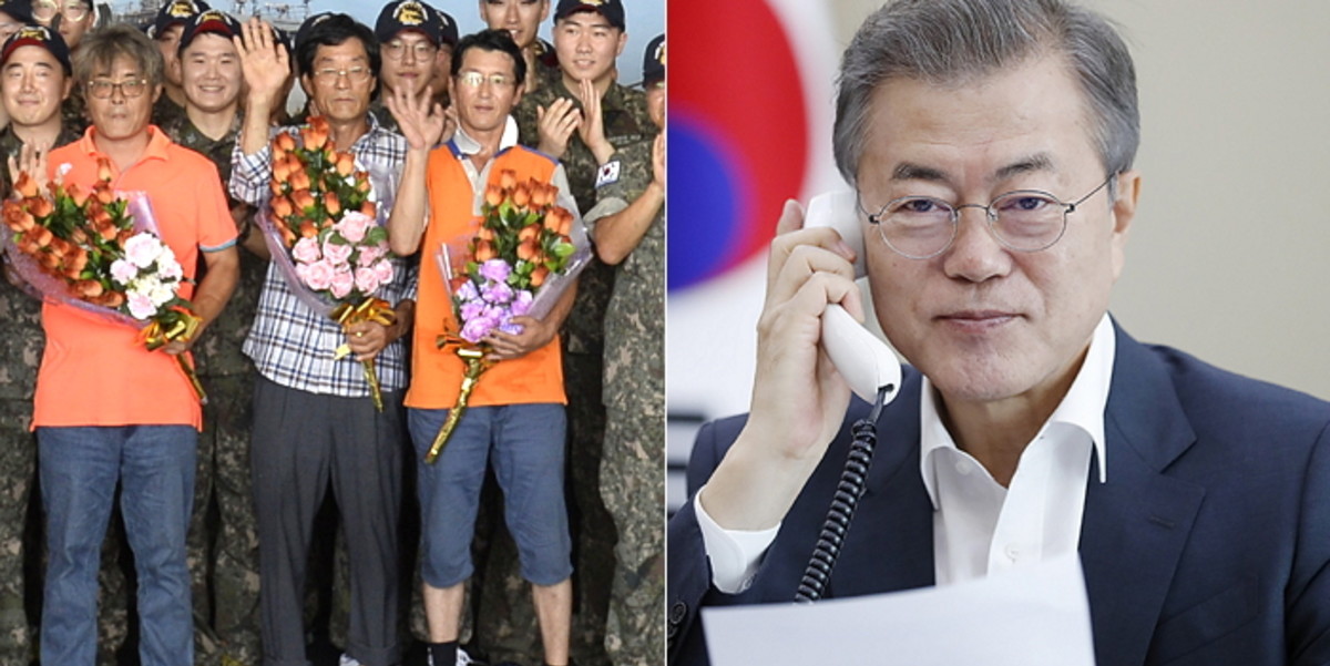 마린711호 현용호 선장, 정대영 기관장, 김일돌 항해사는 문 대통령과 통화하며 그간의 상황을 전했다.