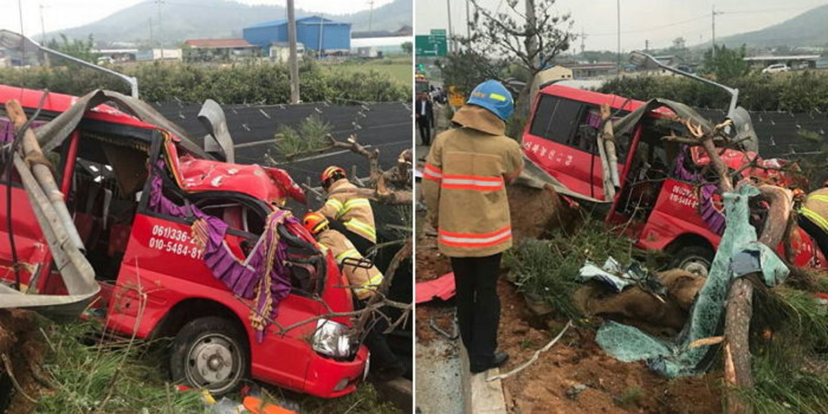 당시 미니버스는 SUV와 부딪힌 뒤 오른쪽 가드레일을 박았다. 이어 가로수와 가로등에 부딪힌 뒤 도랑으로 굴러떨어졌다.
