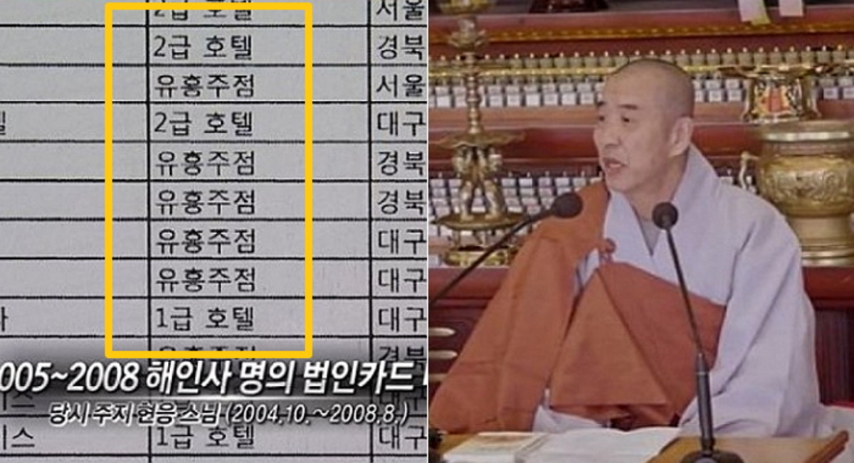 먼저 설정 스님의 서울대학교 학력 위조, 거액의 사유재산에 대해 보도한 PD 수첩은 이어 현응 스님이 해인사 주지로 재직하던 지난 2005~2008년 당시 법인카드 사용 내역을 공개했다.