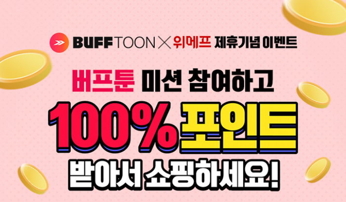 버프툰은 ‘웹툰 미션’ 이벤트를 마련했다. 이용자가 버프툰 가입, 베스트 웹툰 구독 등 3개 미션을 완료하면 위메프 포인트(미션 당 1천원, 최대 3천원)를 제공한다. 버프툰 어플리케이션에서 선착순으로 참여 가능하다.