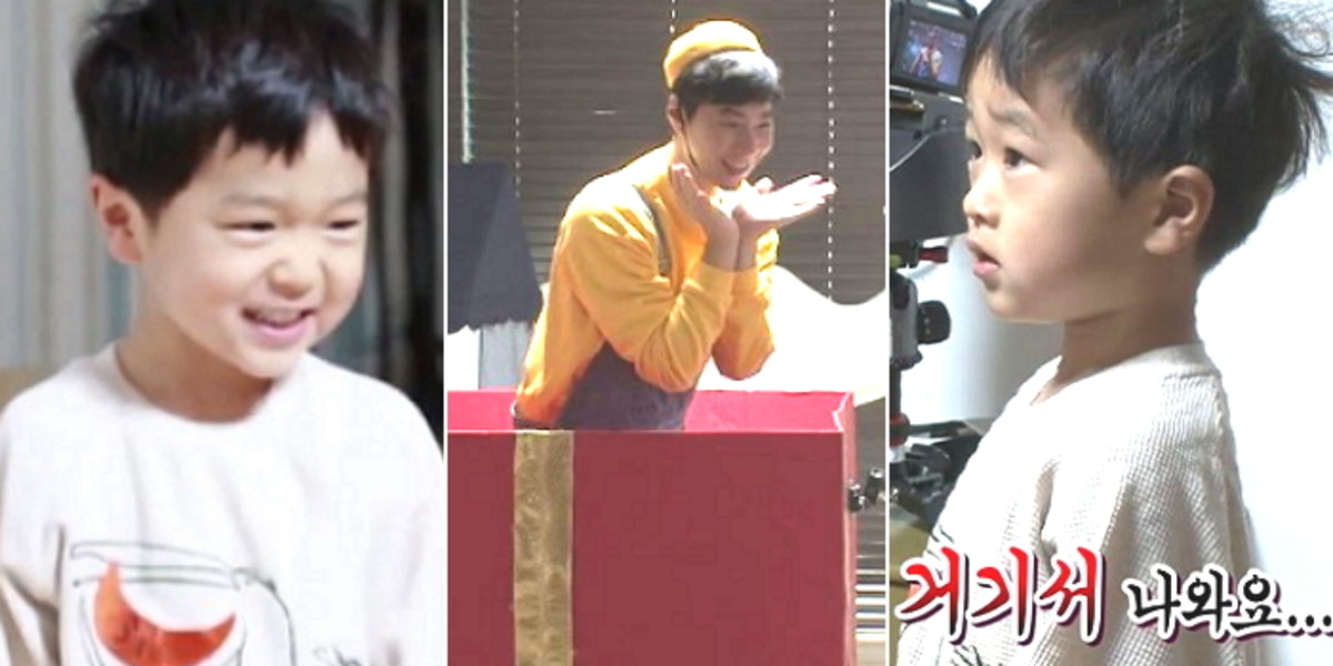 '어린이날'을 맞아 노란색 유치원 복을 입고 숨어있던 고지용은 "아빠가 승재 선물이야"라는 말과 함께 꽃받침 애교를 선보였다.