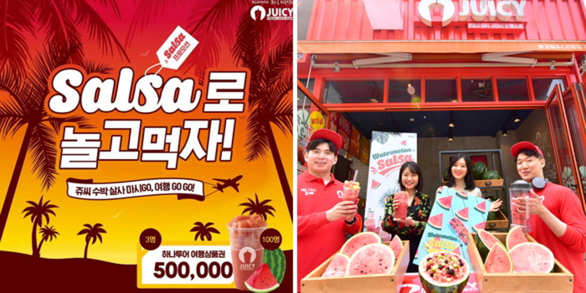 한편 '수박살사'(SALSA)란 라틴아메리카 '살사음악 특유의 흥겨움'과 '살사음식의 어우러짐'이라는 두 가지 특징들을 수박주스에 담았다는 뜻으로 올여름 다양한 수박주스를 쥬씨의 고객들에게 제공한다는 의미다.
