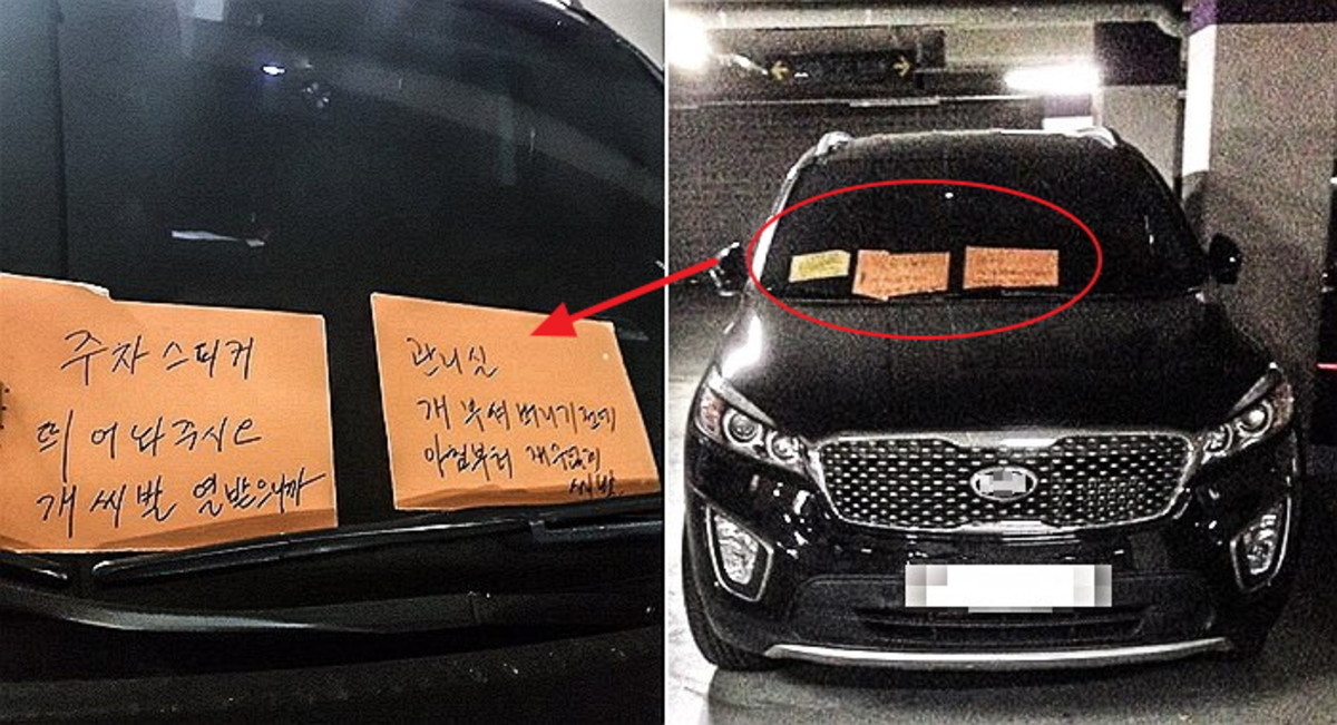 공개된 사진에는 차량 앞 유리 위로 종이 두 장이 눈에 띈다.