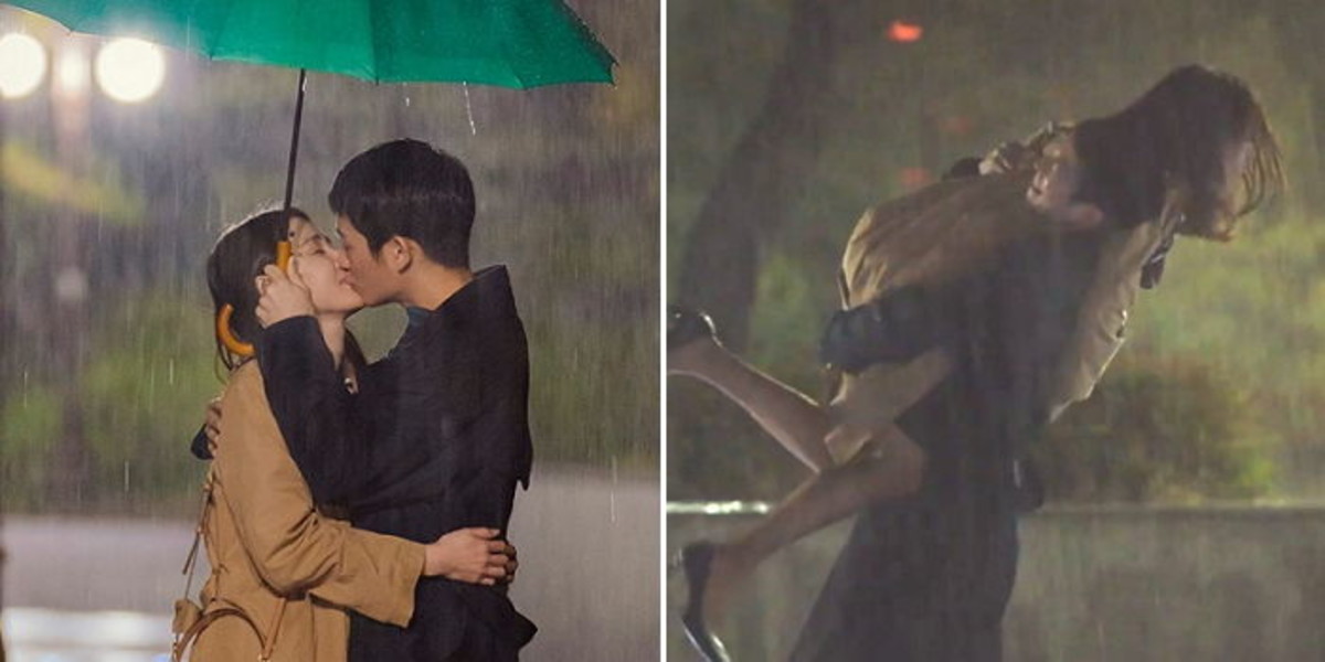 봄비가 내리는 밤거리에서 여유로운 데이트를 즐긴 두 사람은 우산을 쓰고 입을 맞췄다.