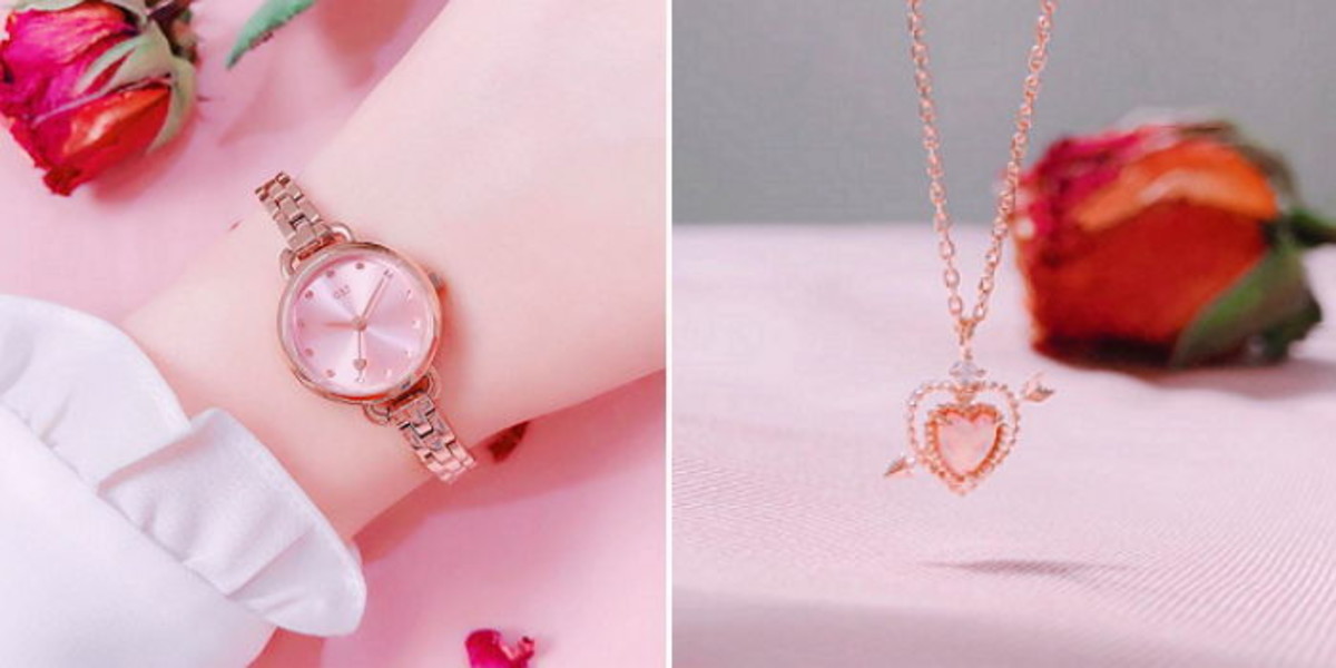 핑크빛 케이스에 시계, 목걸이, 향수가 들어있는 해당 제품은 실용적이고 알찬 구성을 자랑한다.