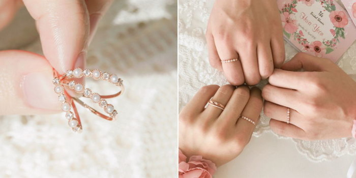로즈골드 색상에 진주 알이 콕콕 박힌 로렛라인 우정링은 우아함을 자아낸다.