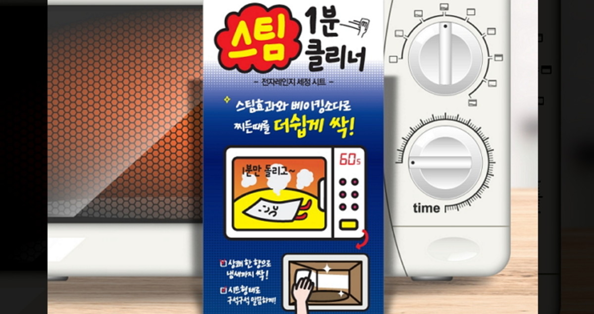 사용법은 1분 스팀 클리너 한 장을 전자레인지에 넣고 1분간 돌려준다. 그 다음 클리너가 뜨겁지 않은지 확인 후 전자레인지 내부의 오염을 닦아주면 된다.