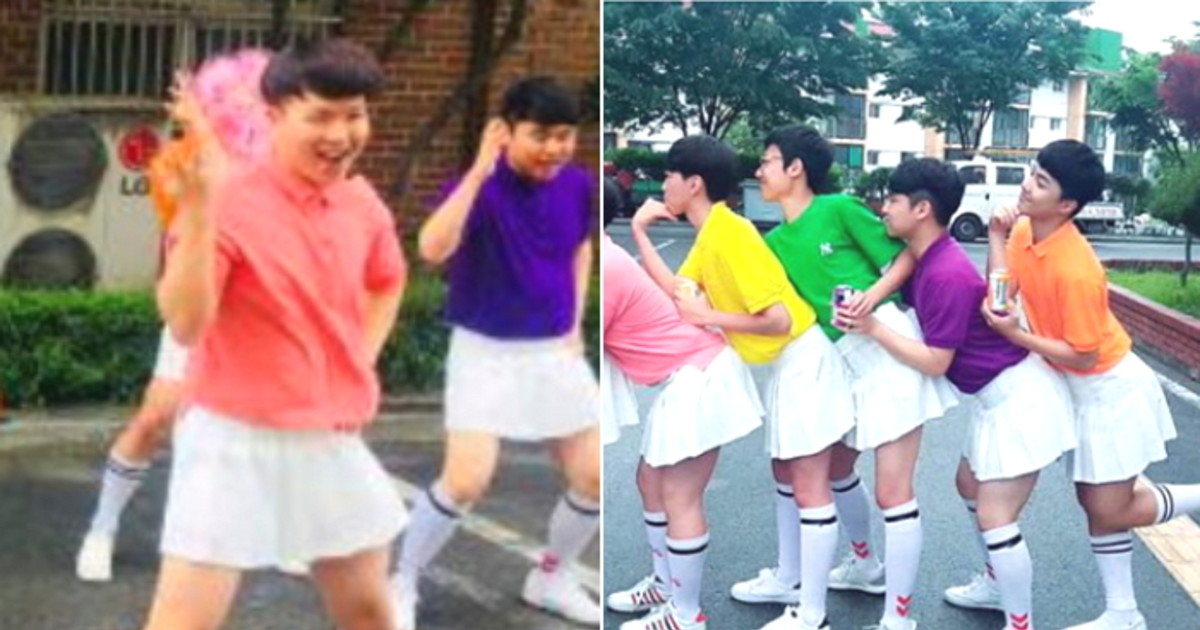 분홍색부터 주황색까지 형형색색의 반팔 셔츠를 입은 6명의 남고생들은 짧은 테니스 스커트까지 구해 입었다.