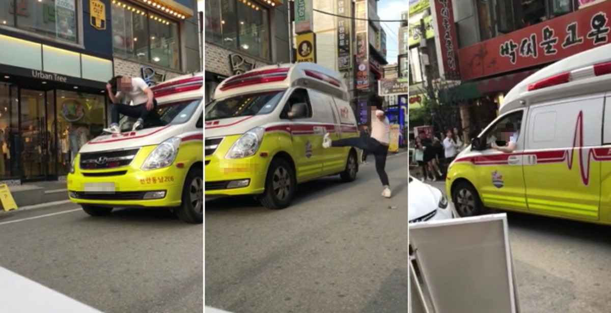당시 현장을 담은 영상에는 구급차 앞문을 발로 차거나 차에 올라타 뛰는 등 분을 삭이지 못하는 그의 모습이 고스란히 담겼다.