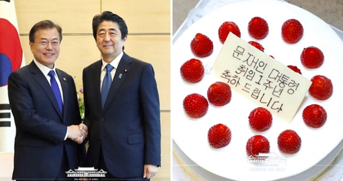 오찬이 끝날 무렵 아베 총리는 문 대통령에게 '깜짝 선물'을 전달했다. 하얀색 크림으로 뒤덮이고, 딸기가 얹어진 케이크였다.