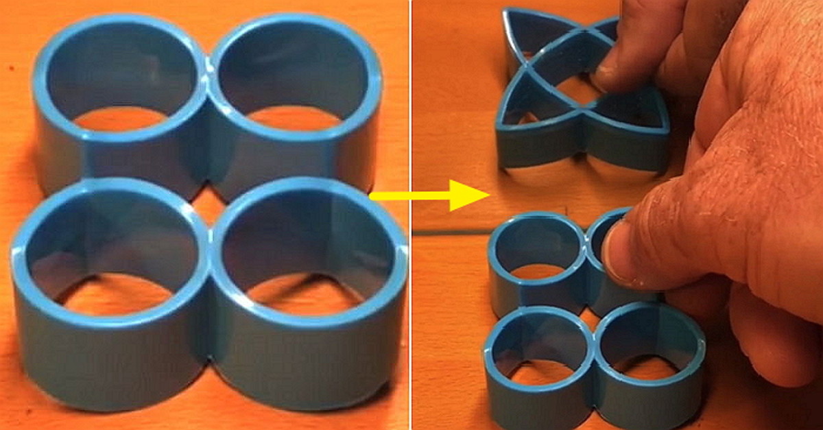처음 영상이 시작됐을 때는 양 끝이 뾰족해 보이는 별의 모양이, 물체를 돌렸을 때는 네 개의 원기둥이 보인다.